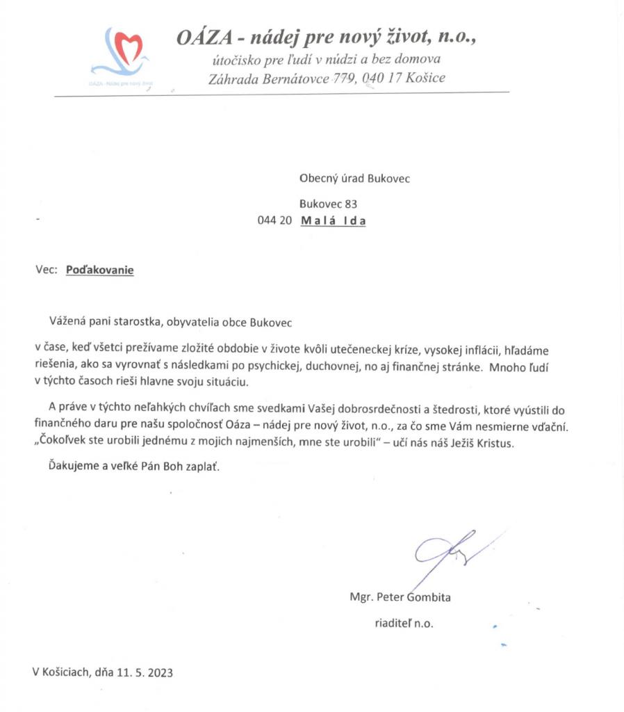 Obdržali sme poďakovanie za organizovaný Charitatívny beh Obcou Bukovec, ktorý sa uskutočnil dňa 08.mája 2023. Účastníci behu prispeli sumou 1075 Eur pre ľudí v núdzi a bez domova. Všetkým ďakujeme!