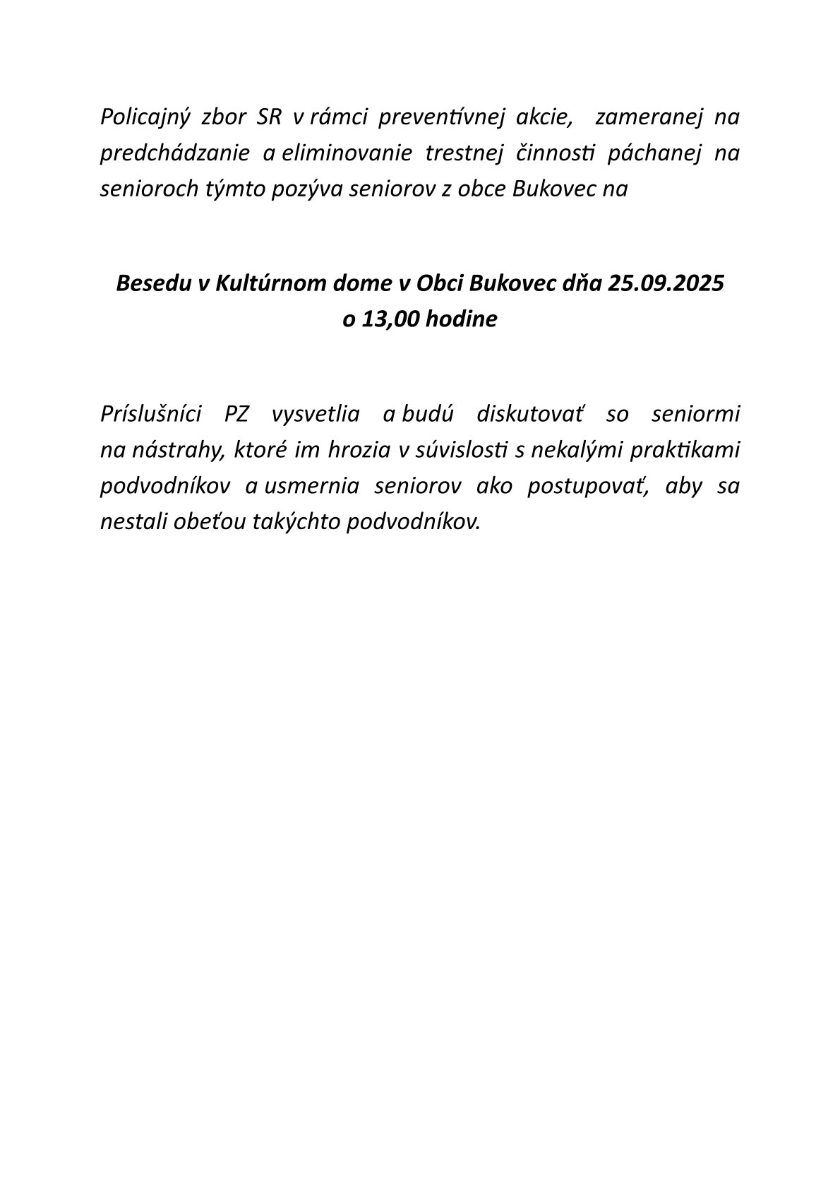 Policajný zbor SR pozýva všetkých seniorov na besedu v Kultúrnom dome v Obci Bukovec dňa 25.09.2025 (štvrtok) o 13,00 hod.
