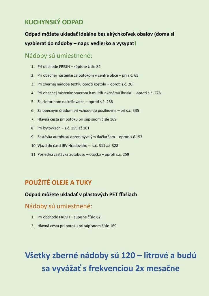 Obec Bukovec zavádza prostredníctvom ESPIK Group s.r.o. zber a zneškodňovanie kuchynského odpadu a použitých olejov a tukov na stojiskách v prílohe