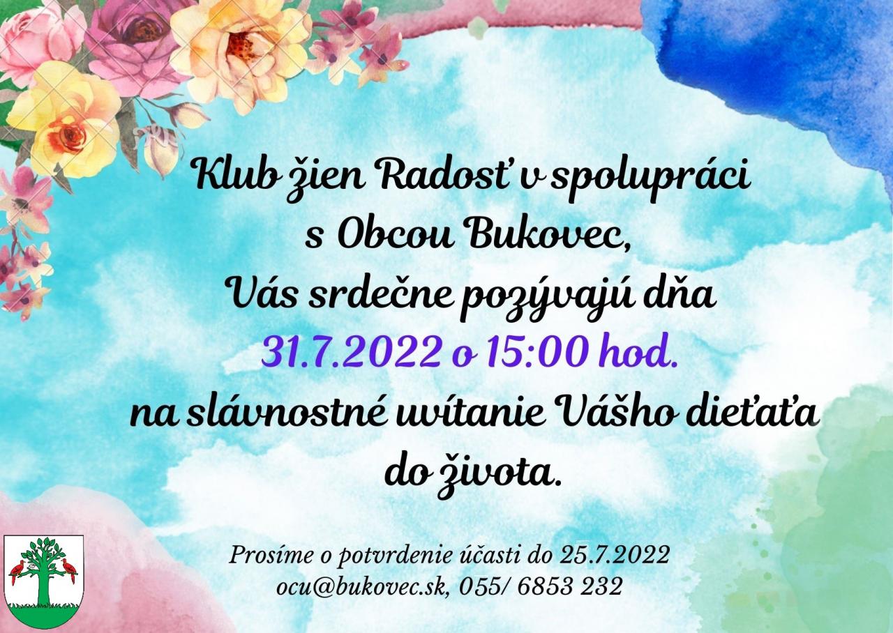 Poslednú júlovú nedeľu sme spoločne s Klubom žien Radosť privítali našich najmenších Bukovčanov. Ďakujeme klubu za prípravu tohto krásneho podujatia. Detičky obdržali rozprávkovú knižku a krásne drevené kocky. Okrem toho nechýbalo pohostenie pre deti a rodičov, krásna torta a pamätné listy.