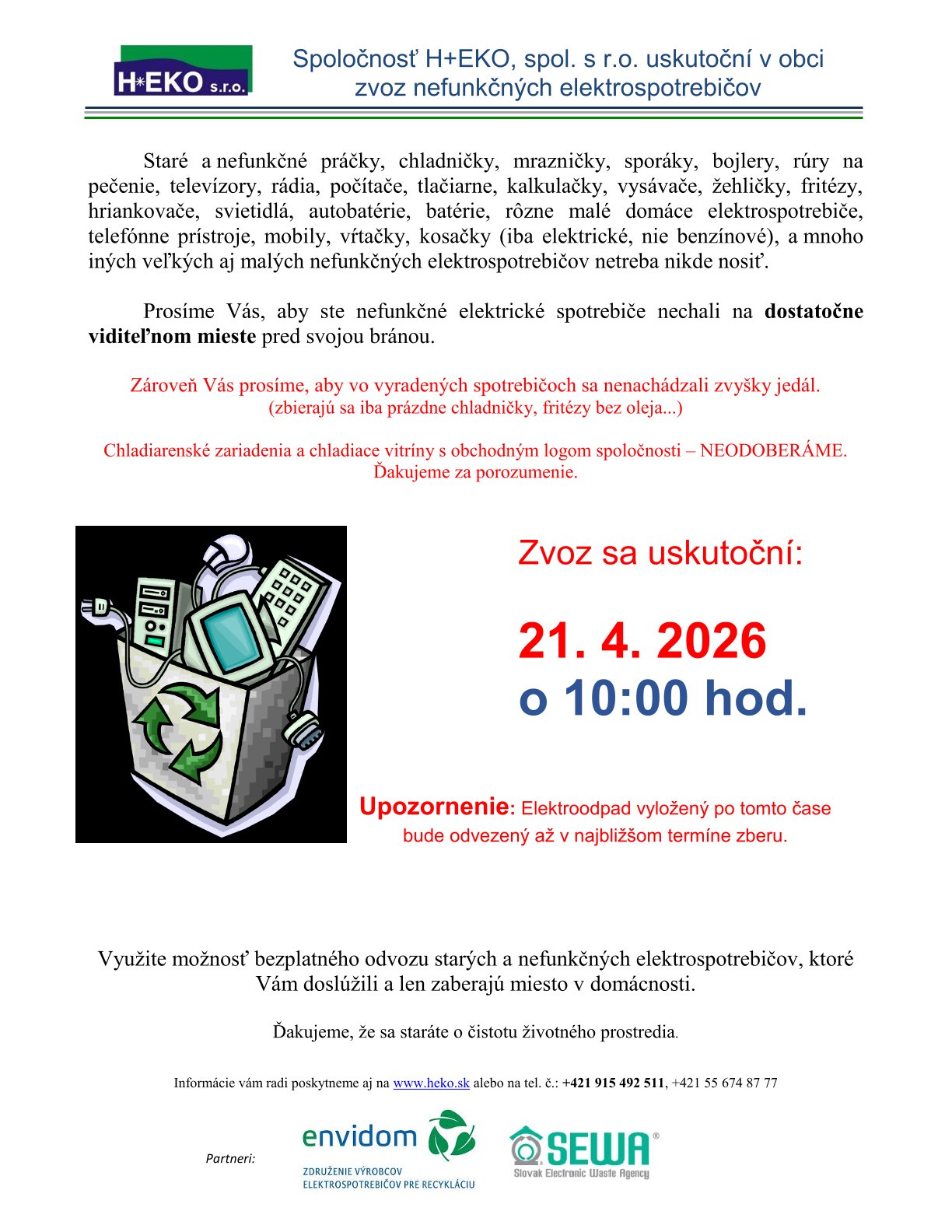 Zber elektroodpadu sa uskutoční 21.04.2026 o 10 hod.